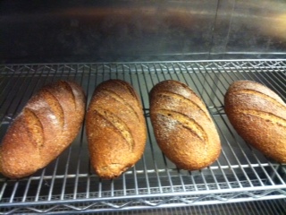 Krissy, our Bread Baker Extraordinaire, is on her way to Disney World with her husband and two small children, and Tracy, her relief baker, is off today and tomorrow. And we are two pastry cooks down, which means I spent a large chunk of my day today at work. I arrived at 5 a.m. to make the breakfast pastries, something I haven't done in probably four years. I made biscuits, brioche, chocolate-filled Danish called Babka and raisin bran muffins. To be clear, Tracy made the Babka and brioche days ago, and simply pulled some from the freezer for me to proof and bake. Then, I started the bread for the day. I only had to make the dinner bread, since Krissy and Tracy have been baking ahead for this week, but Krissy has so far surpassed my bread knowledge since I was last her boss, I don't understand her recipes. I had to skip the normal rotation and pull up some old recipes from the computer. I made one I love from the old days, sunflower wheat rolls, but I didn't take pictures. Suzie baked them tonight; they were still in the fridge when I left. I did make this sourdough rye bread from an unfamiliar but understandable recipe, and it came out quite lovely. It was my first time "loading the deck oven," in which one flours a pizza peel (those long wooden spatulas you see at pizza restaurants), gently lifts the risen loaf onto the peel and pops it into the oven, right on the oven floor.